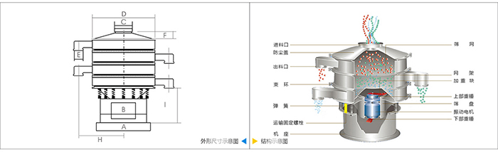 其結構可以簡單分為,篩框篩網機蓋、底座和電機;內部還裝有彈跳球,密封件等。整機一般采用304不銹鋼材質,為節省成本,也可將底座換成碳鋼材質,不會對物料造成影響但其底座會出現生銹掉漆的現象,小編還是建議大家選用全不銹鋼材質的;同時其內部彈跳球、密封件皆采用硅膠材質,安全衛生。